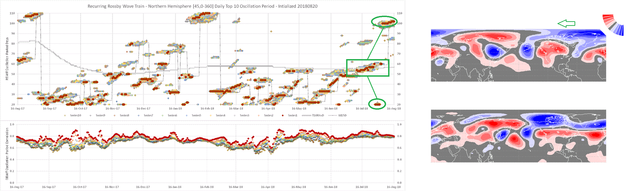 With the above criteria a global daily top 10 is constructed from each of the seven regions. These top 10 are then constructed into a daily running average for the given calendar year and a 15 day mode from present (M15D). Along with these frequencies, a daily average of the regional running averages is also constructed (RAxD). To overcome an evident intraseasonal jet position bias the method also seeks the top correlated frequency interval from the previous 720 days based from the present RAxD frequency (BeOP).